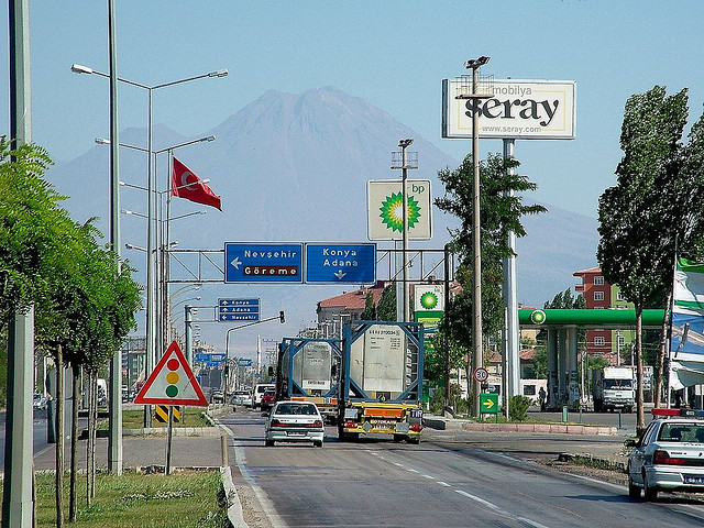 vanaf de rondweg is NAR ten N v NEVŞEHIR te zien en daarna aankomst in CAPPADOCIE (met ÜÇHISARs kasteel in de verte)