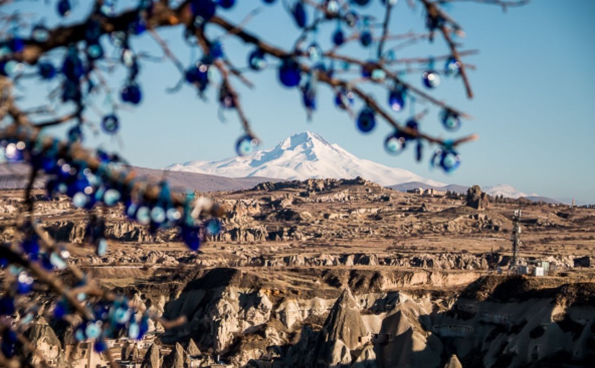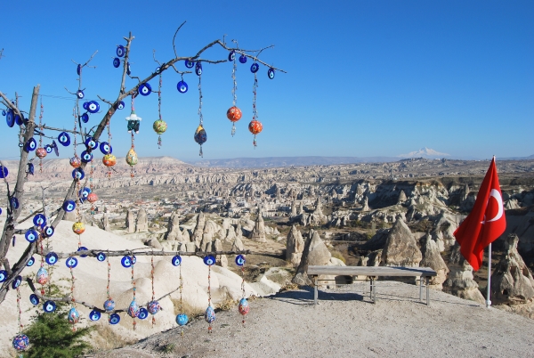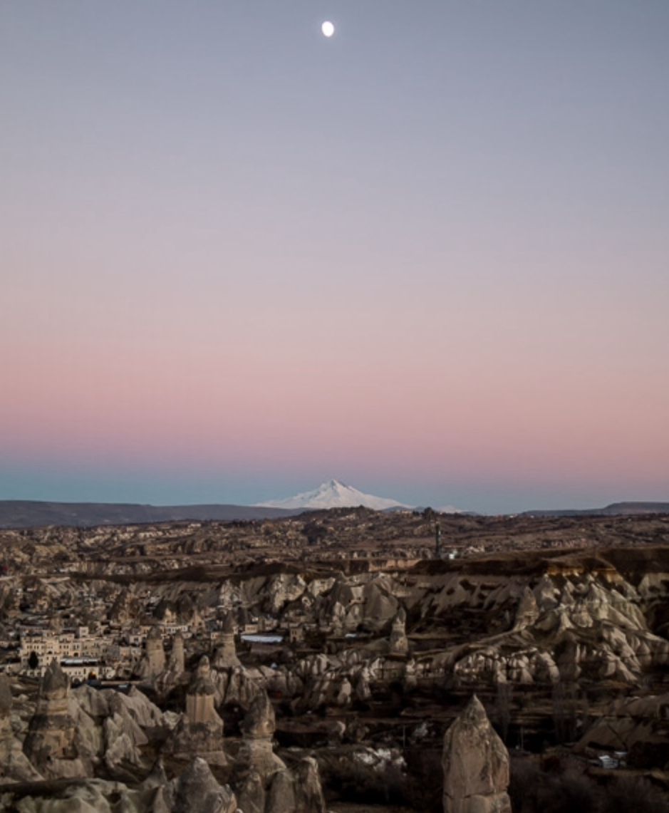 ESENTEPE VIEWPOINT (zicht op ÜÇHISAR van de andere kant, berg ERCIYES en GÖREME beneden)